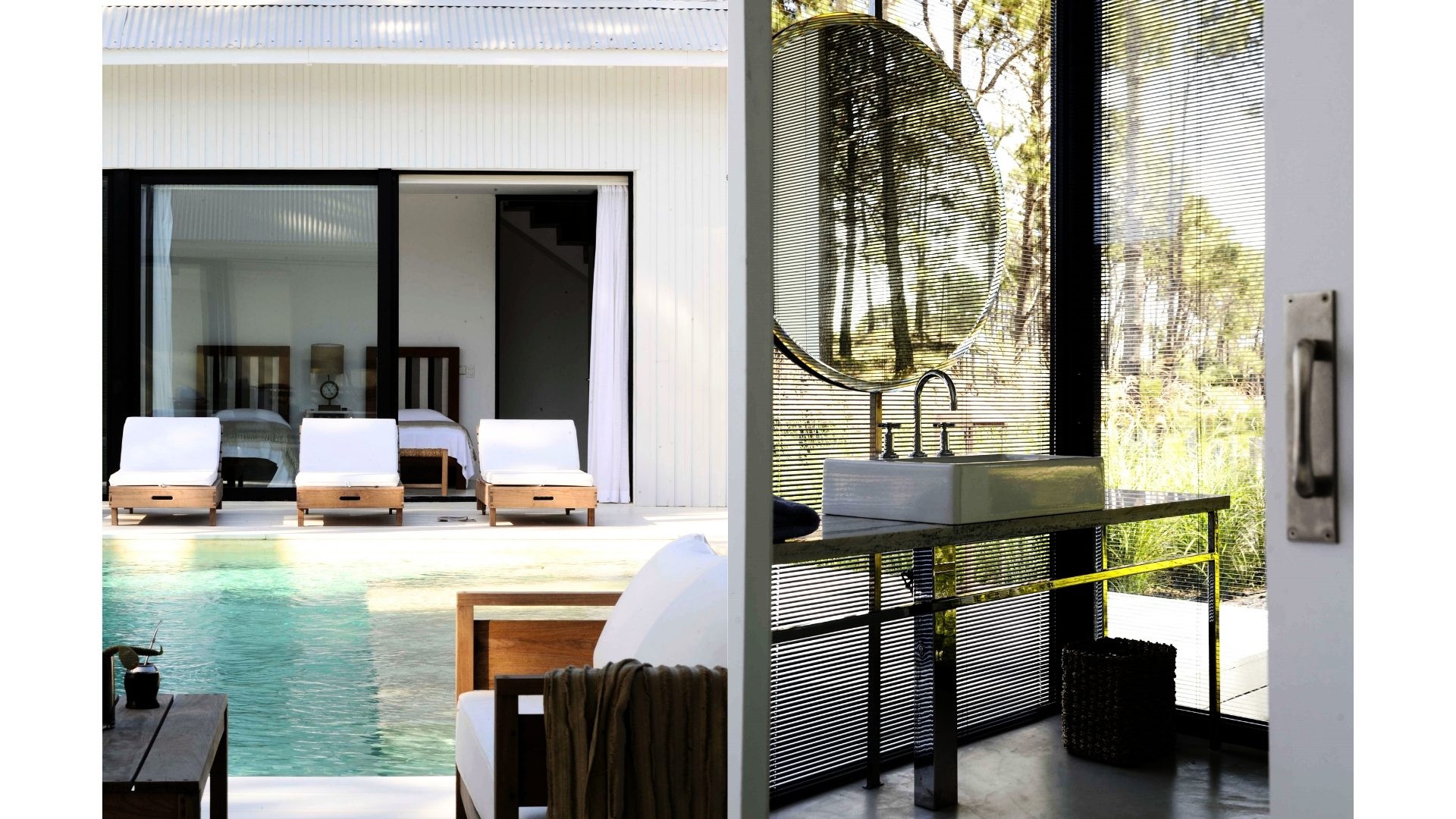 The house is located on a long plot running parallel to the street. The project made of a combination of light structures, with to maximize the built surface while at the same time minimizing the cost. Each of the two main volumes has a specific role – one dedicated to social life and the other to the rooms. They communicate through a veranda of black timber that runs along the pool. The structure of both buildings consists of eucalyptus pillars and iron beams that support a wooden roof covered in corrugated steel, with a top cornice creating an areas of shade.